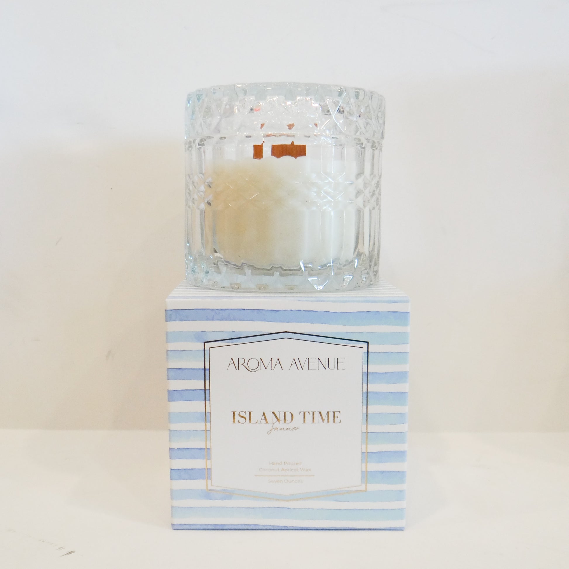 The alluring “Island Time” candle, a harmonious blend that captures the essence of a serene coastal retreat. Immerse yourself in the refreshing scents of linen, eucalyptus, and sea salt, as this captivating candle is designed to have you feeling like you escaped to a tranquil island getaway, where time slows down and worries fade away.