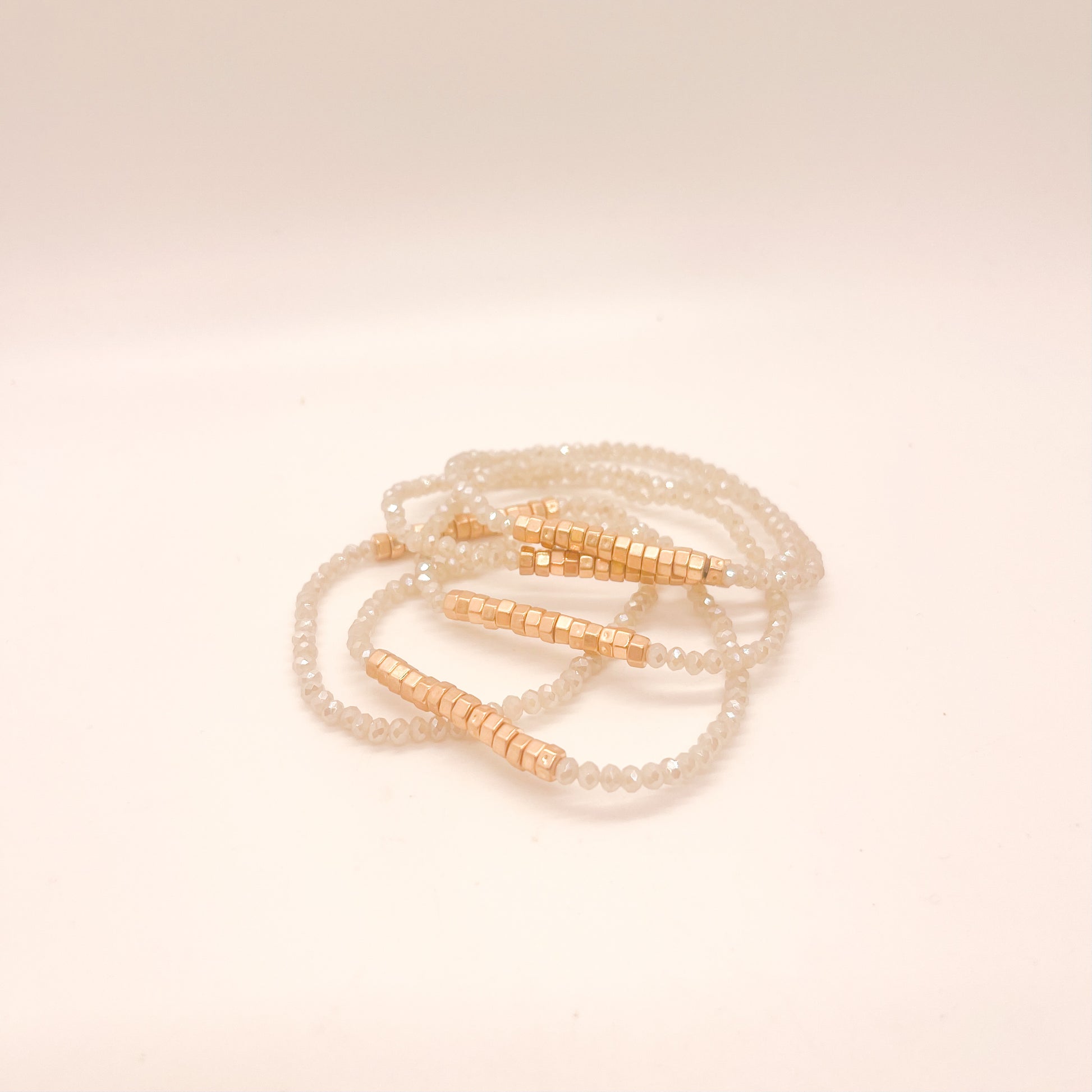 Elevate your everyday style with this stunning set of five grey sparkly bracelets, each adorned with gleaming gold beads. Perfect for layering or wearing individually, these versatile pieces add just the right amount of shimmer to any outfit. Whether you're heading to the office or out for the weekend, this bracelet stack brings effortless elegance to your wrist. Mix and match to create your own unique look, or wear them together for maximum sparkle. A wardrobe essential that supports your personal style journey.