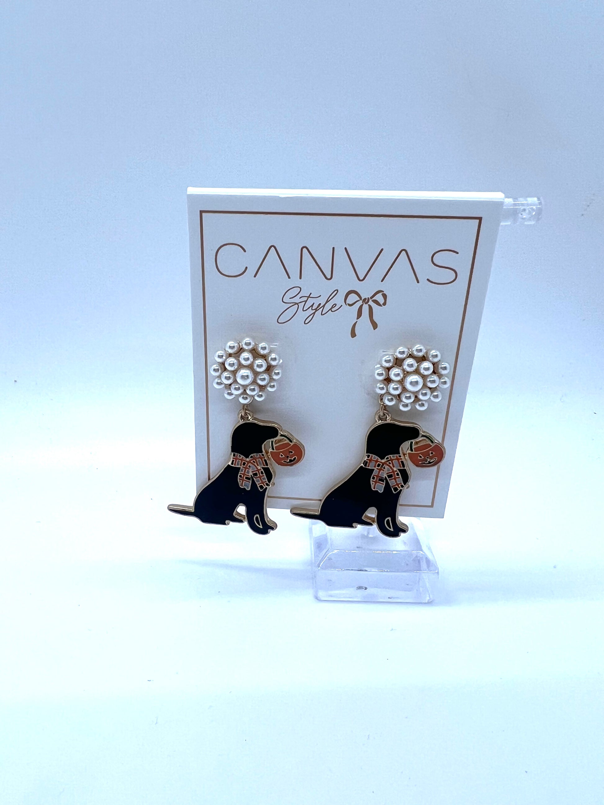 Make a statement and accessorize with these playful canvas style earrings, featuring an all-too-adorable black puppy surrounded by pumpkins and pearls. A perfect gift for all animal and Halloween fans!