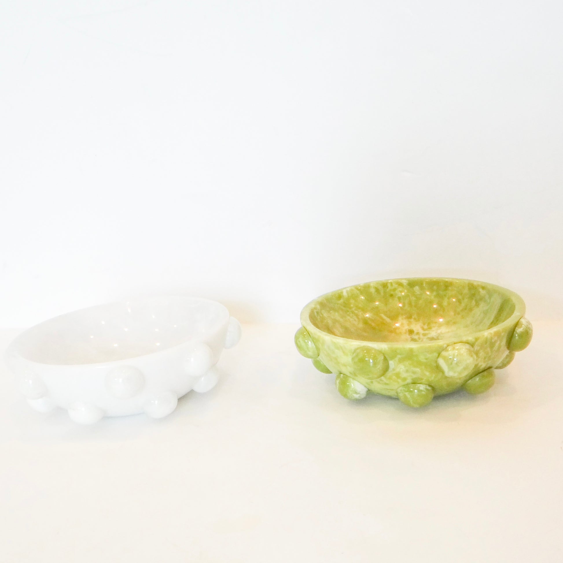 Handcrafted in India, this charming jewelry dish brings playful style to your vanity or nightstand. The whimsical bubble detail adds visual interest while keeping your rings, earrings, and delicate accessories organized and within reach. Choose between crisp white or fresh green to match your décor. A thoughtful piece that celebrates artisanal craftsmanship while serving a practical purpose.