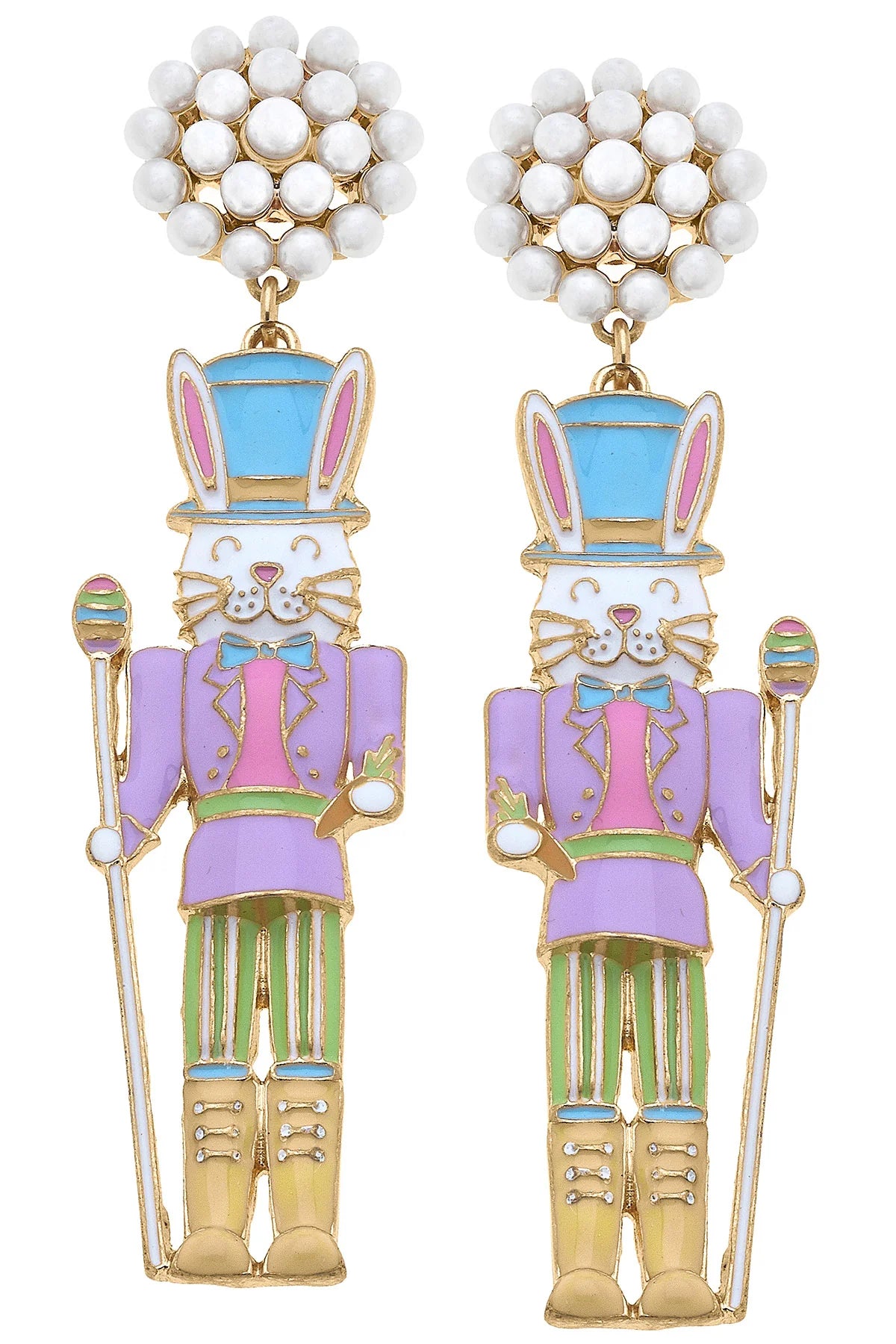Get ready for the perfect Easter accessory with our Canvas Nutcracker Bunny Earrings. These adorable earrings feature a pearl cluster at the top and come in a variety of pastel colors. Brighten up any Easter Sunday outfit with these must-have earrings!