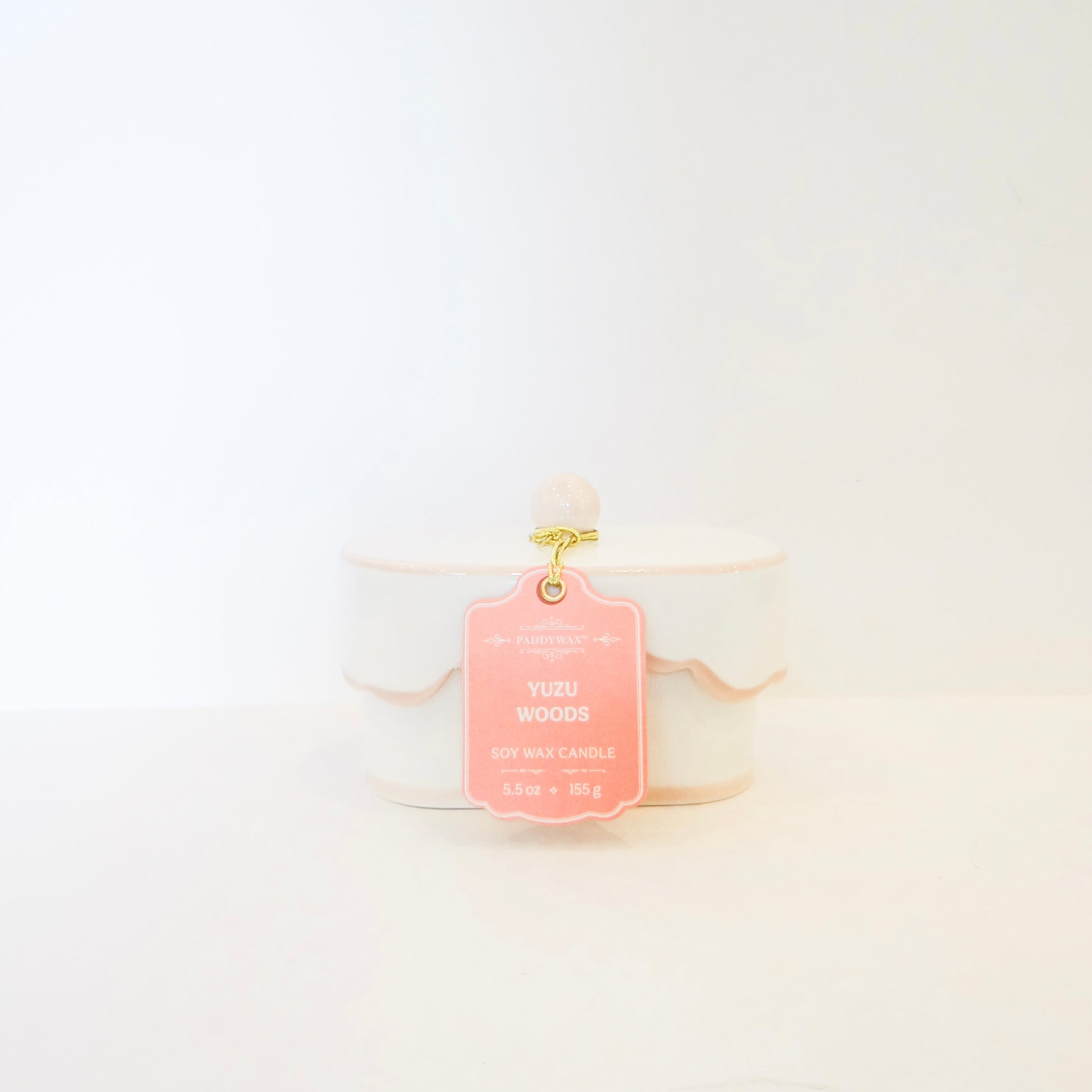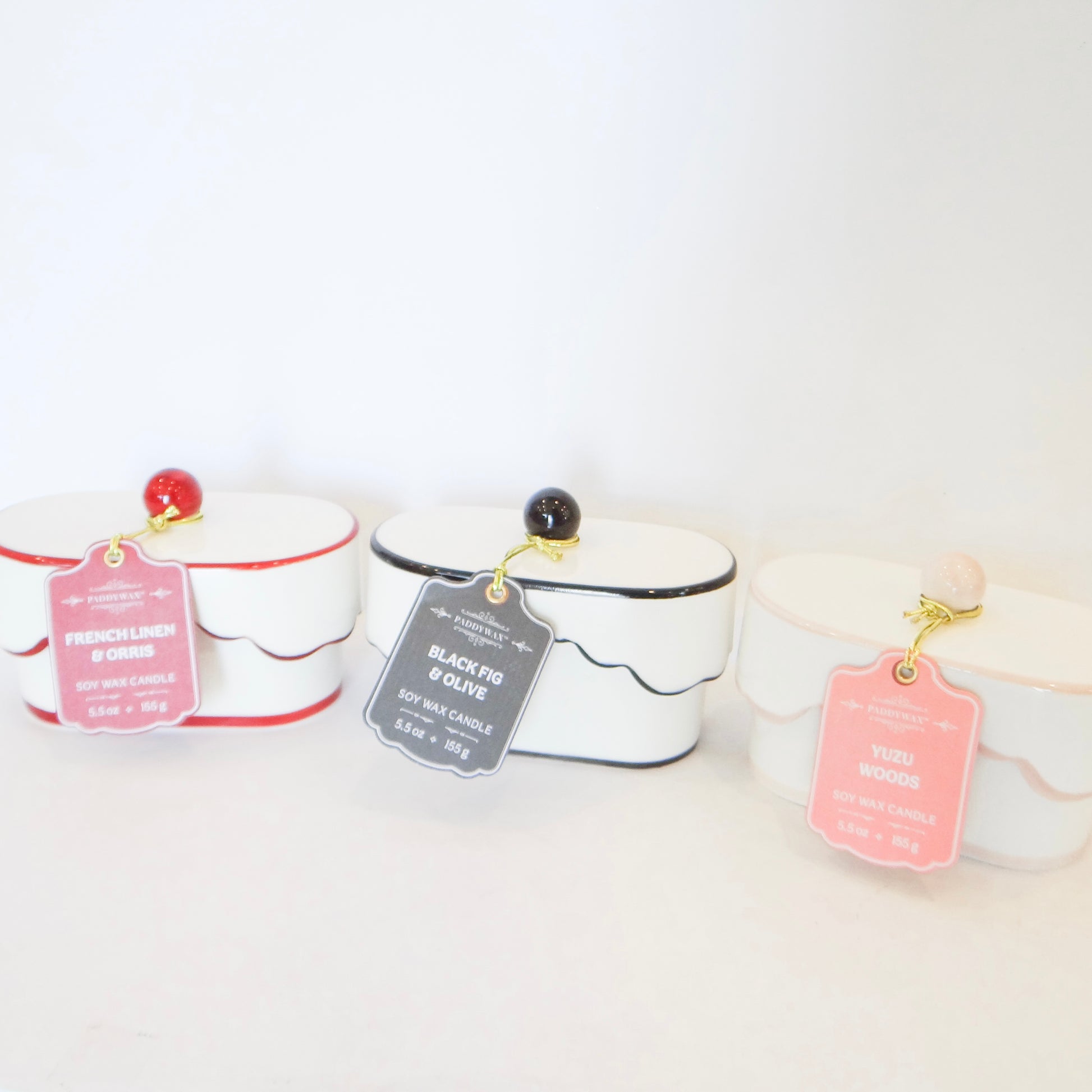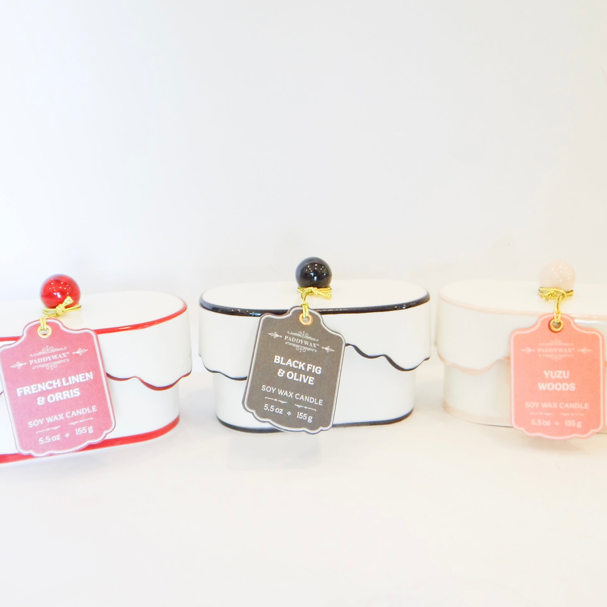 The Cherie candle comes in a large porcelain vessel with hand-painted details along the scalloped rim and knob.