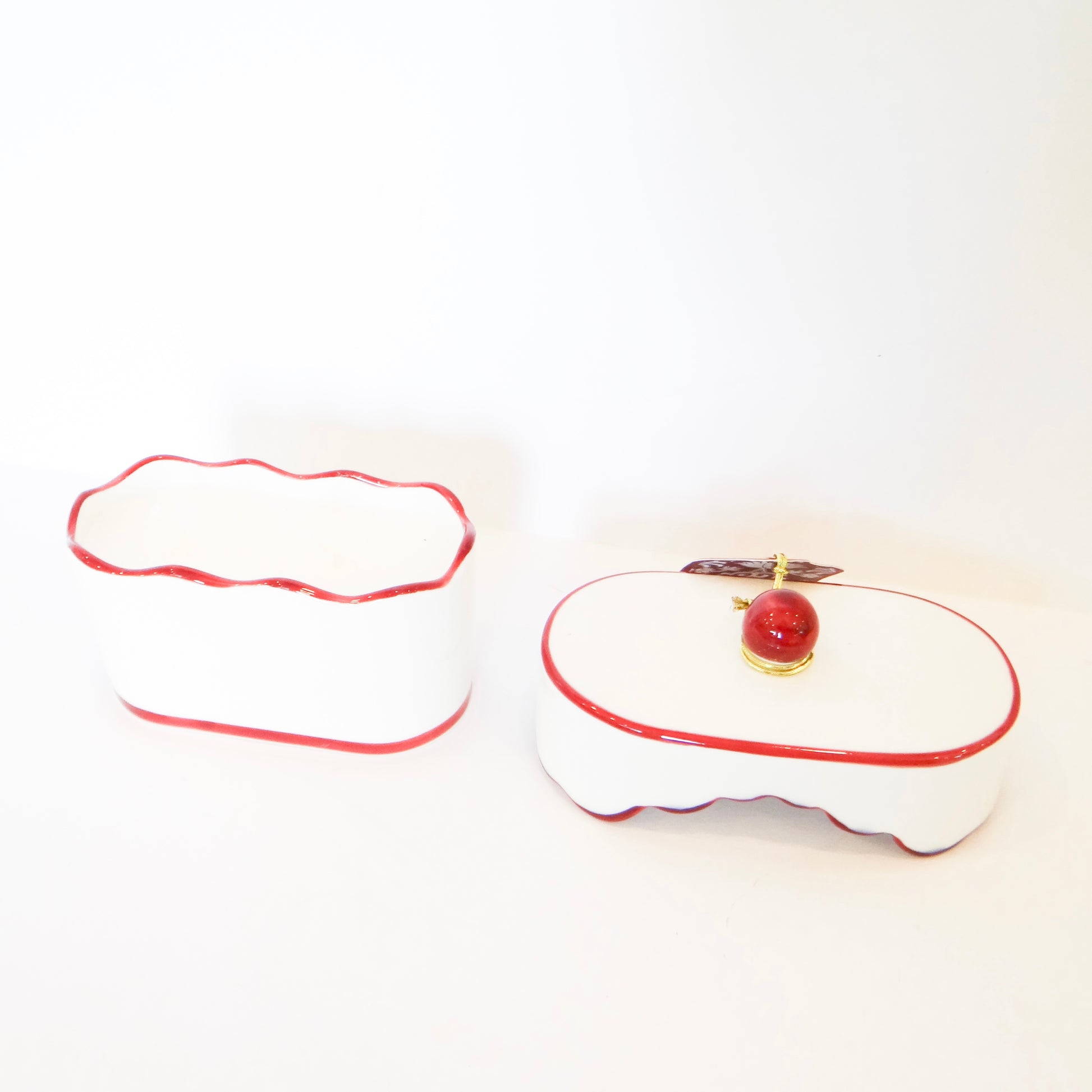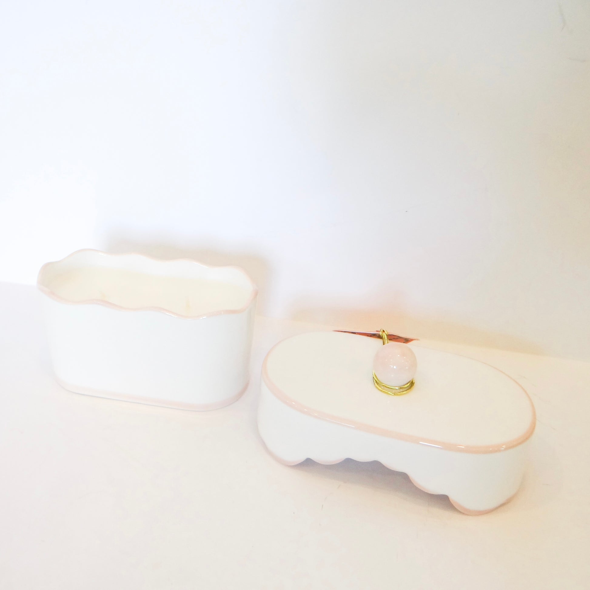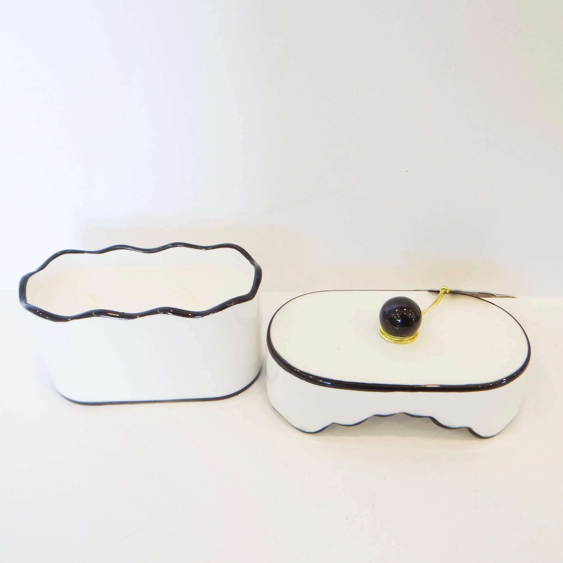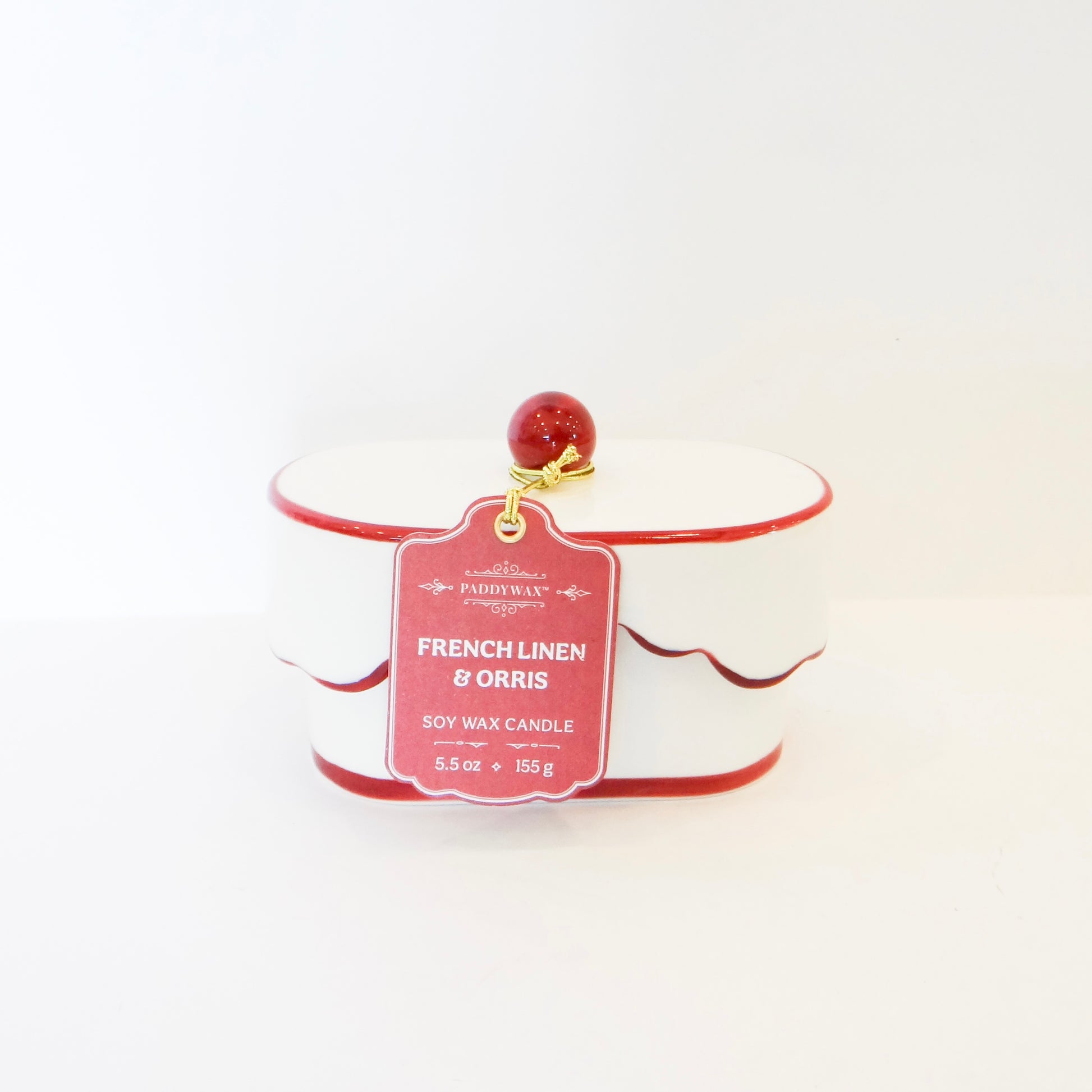 The Cherie candle comes in a large porcelain vessel with hand-painted details along the scalloped rim and knob.