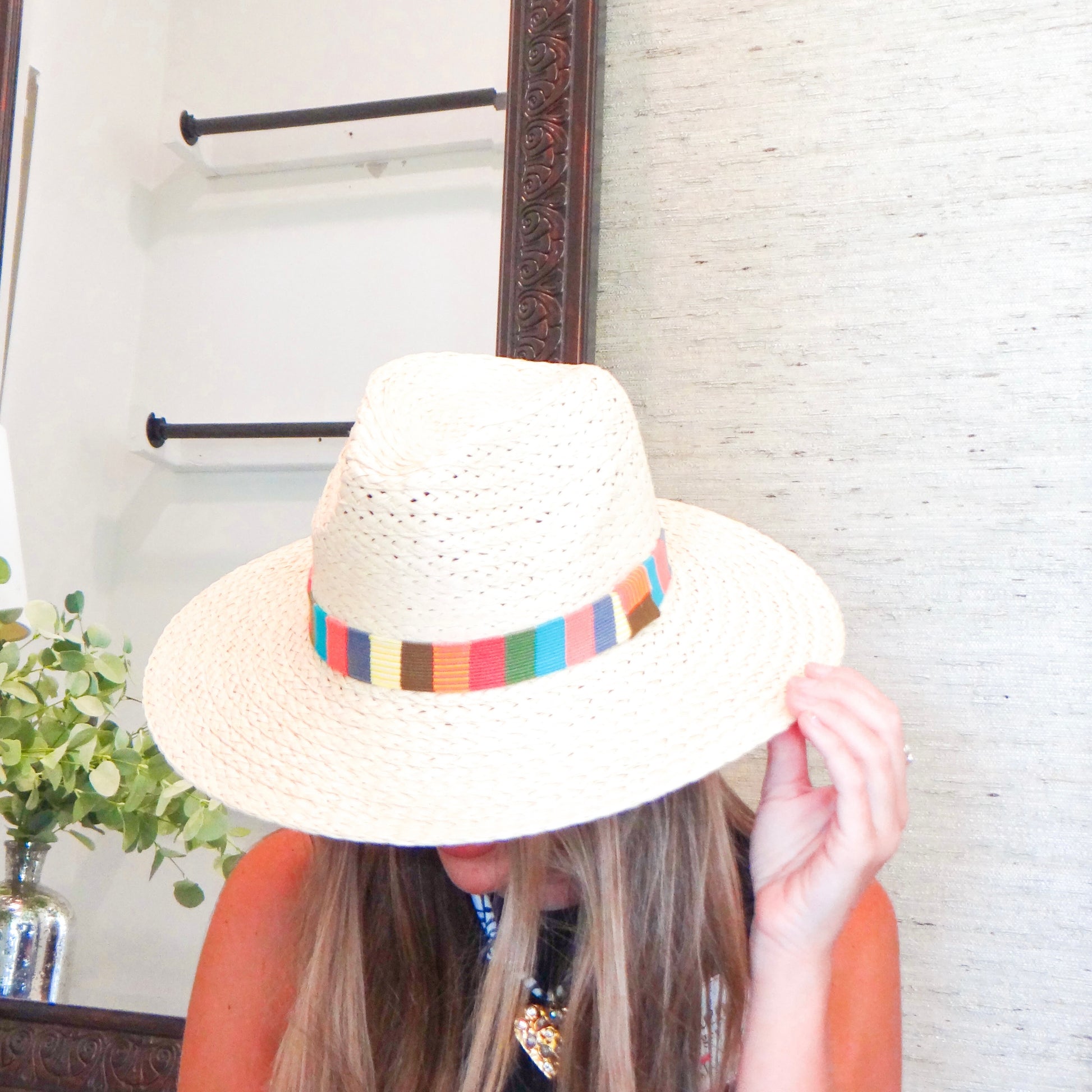 This straw hat features a vibrant, colorful striped band that adds a playful touch to any outfit. Its adjustable design ensures a comfortable fit, making it perfect for game day or casual outings. Stay stylish and protected from the sun with this trendy, fun accessory.