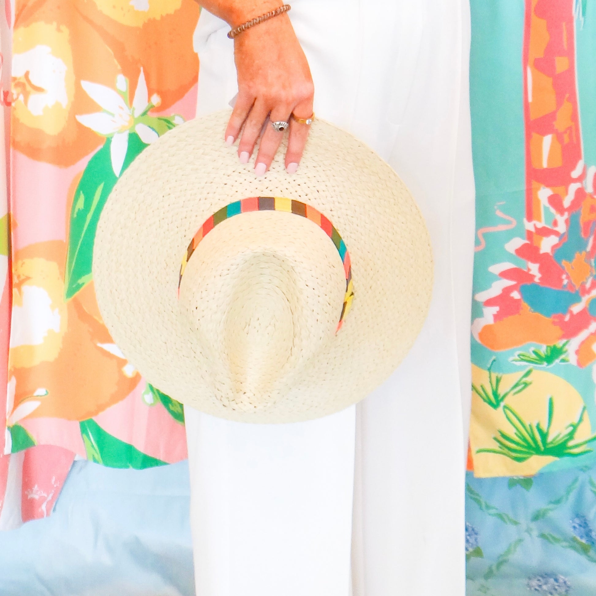 Embrace sunny days in style with this charming tan straw hat, perfect for beach outings and warm-weather adventures. The natural woven straw construction offers breathable comfort, while the vibrant multicolor striped band adds a playful pop of color. Lightweight and packable, this versatile summer essential shields you from UV rays while keeping your look effortlessly chic. Whether you're lounging poolside or exploring coastal destinations, this hat combines practical sun protection with eye-catching style.