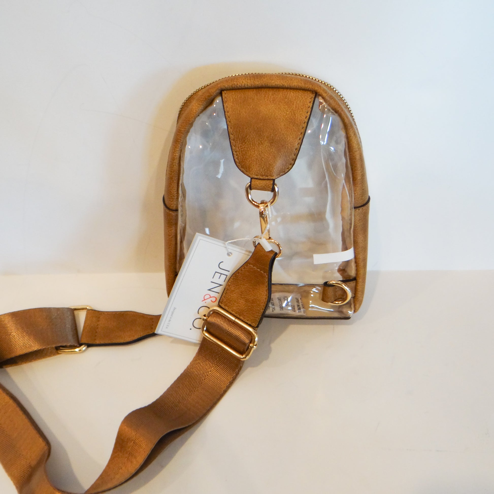 The Ellen Clear Sling Bag combines style and practicality with its clear and brown design. This removable guitar strap-inspired bag can be worn as a backpack or fanny pack, offering versatile ways to carry your essentials hands-free. Its transparent material keeps your items visible yet secure, making it a cute and functional accessory for everyday use.