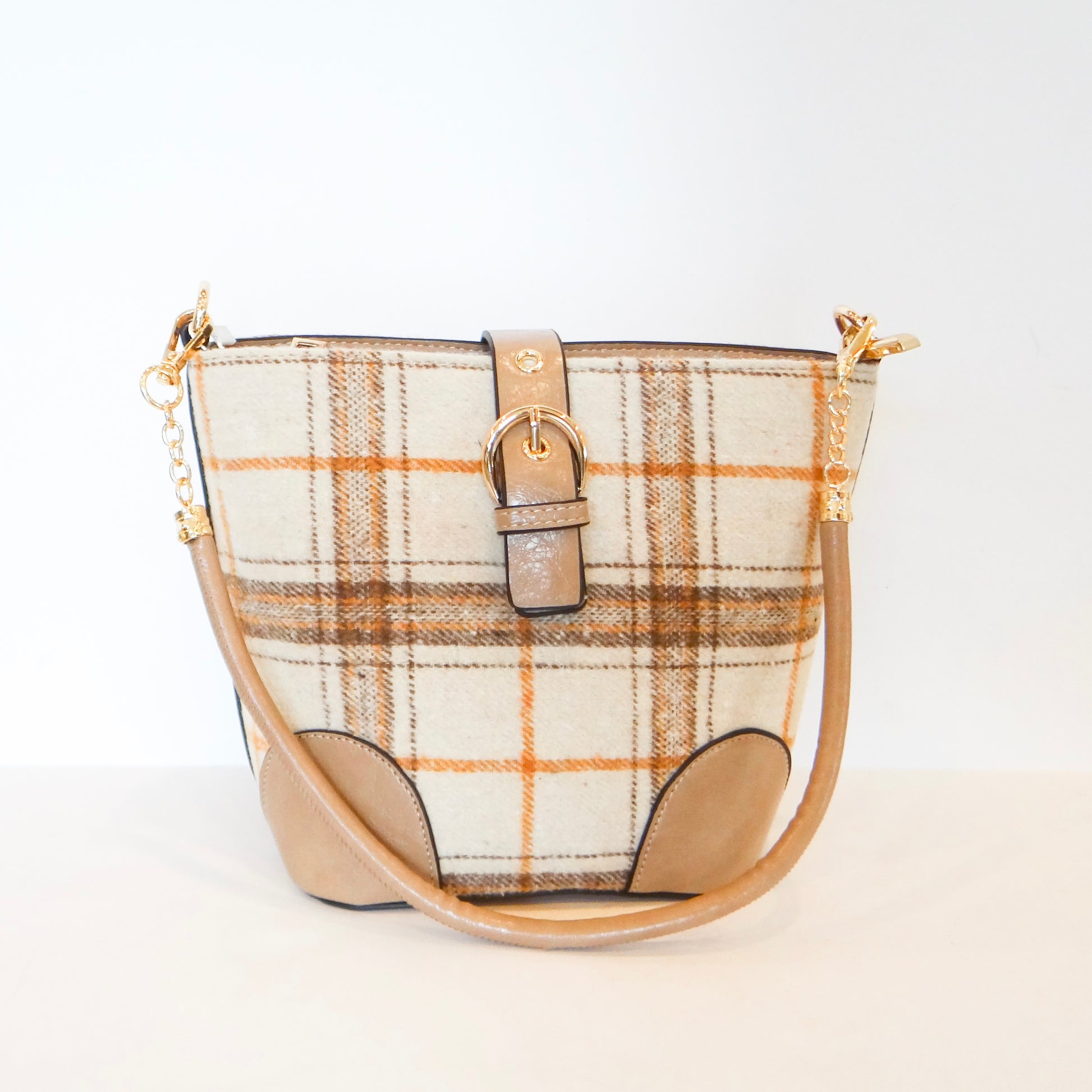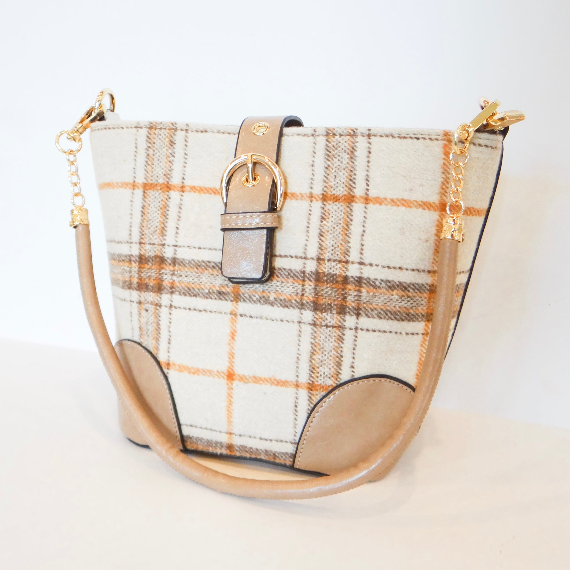 Embrace the season with the Georgina Plaid Bucket Bag, featuring a warm rust and cream palette perfect for fall. Its versatile bucket shape offers ample space for your essentials, making it both stylish and practical. Designed to complement autumn wardrobes, this purse adds a cozy, chic touch to any outfit while keeping your belongings organized and within reach.