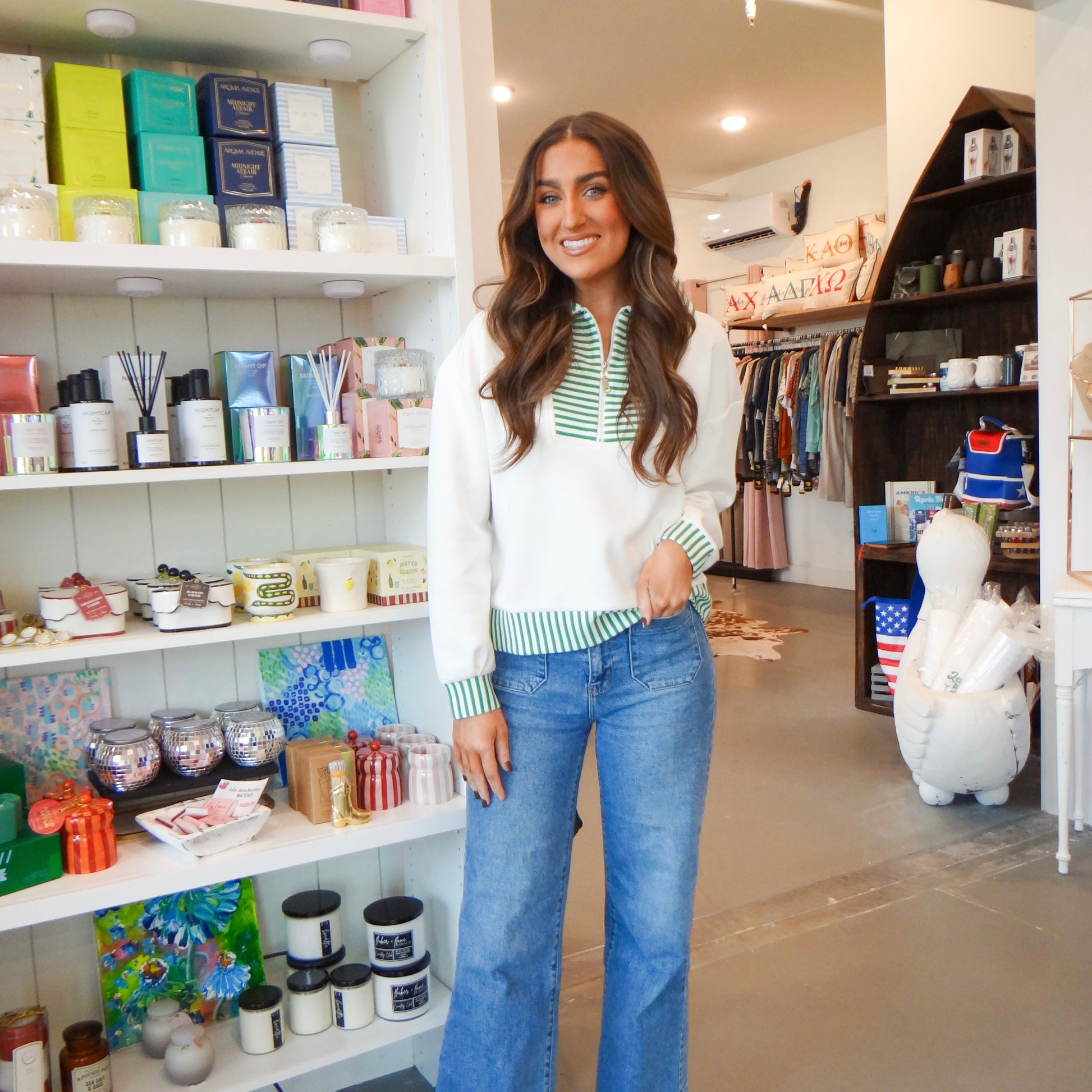 Elevate your casual wardrobe with this versatile white long sleeve quarter zip pullover. Featuring charming green and white stripe detailing, it's the perfect piece for layering through winter and transitioning seamlessly into spring. The relaxed fit and soft fabric make it ideal for everyday wear, whether you're running errands or enjoying a relaxed weekend. Pair it with your favorite jeans or leggings for effortless style that works season after season.