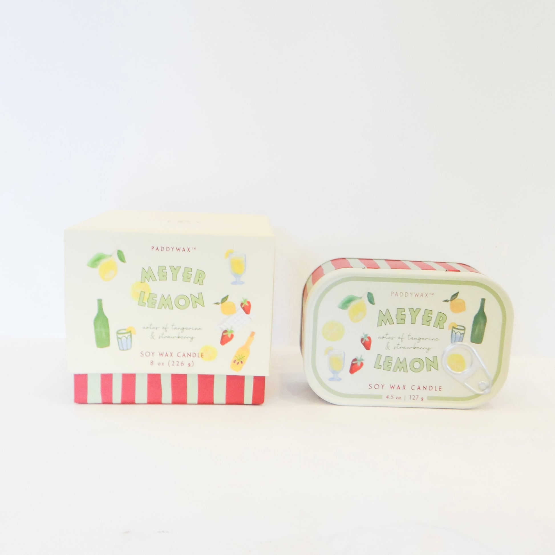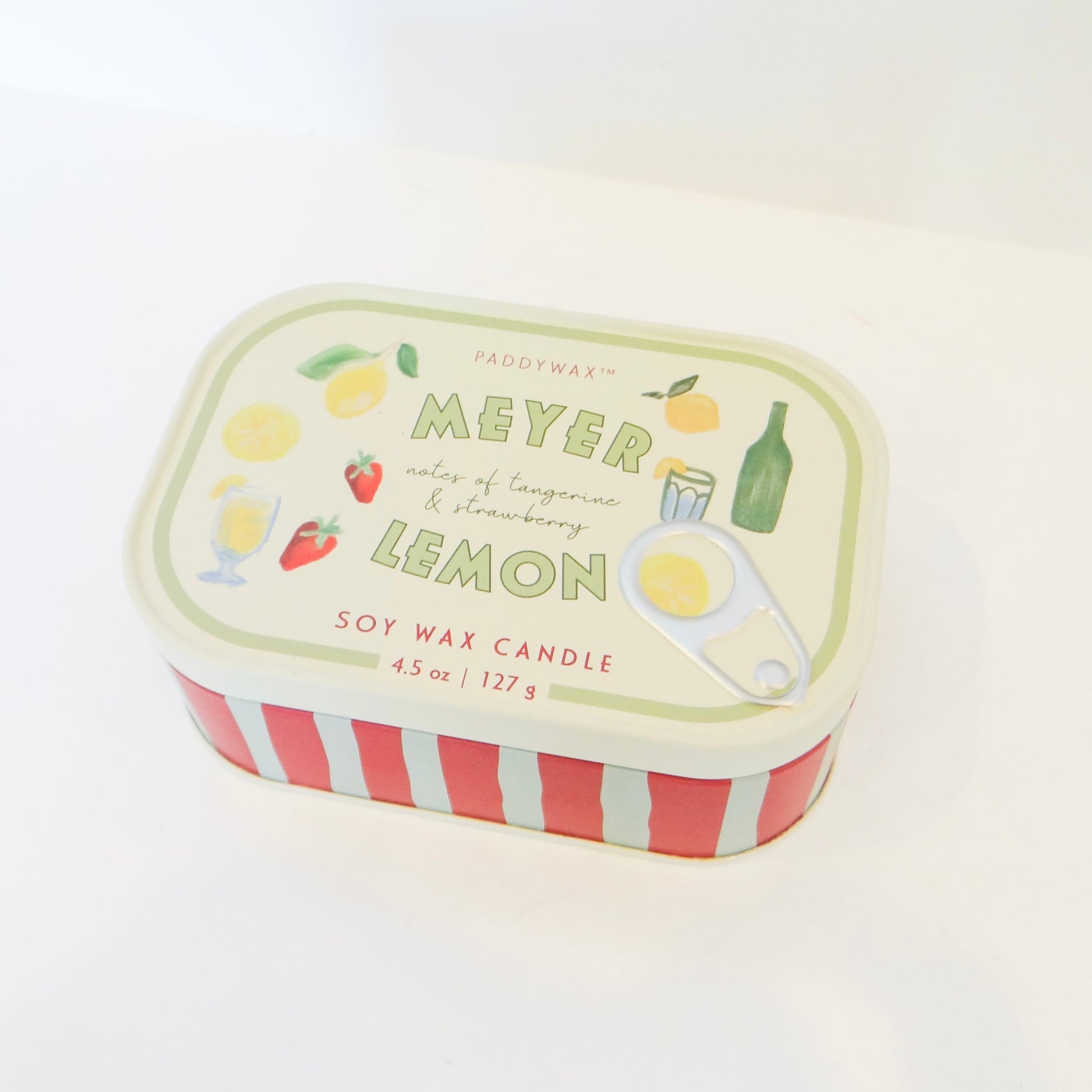 4.5 oz. Two-Wick Tin Candles | With a faux pull-tab for added character inspired by sardine tins, these tin candles with hand illustrated artwork offer a cozy glow with its two wicks, and a comforting scent.