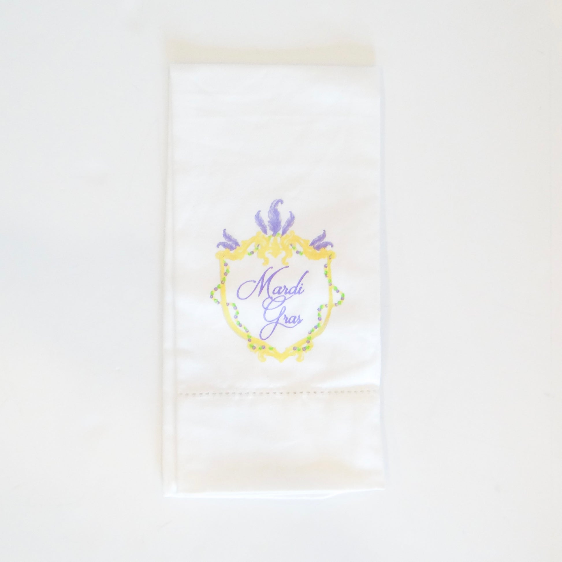 Celebrate the vibrant spirit of Mardi Gras with this elegant hemstitch hand towel. Featuring a distinctive crest design, this piece brings festive flair to your bathroom or kitchen while maintaining timeless sophistication. The delicate hemstitch detailing adds a refined touch that elevates everyday use. Perfect for guests or as a thoughtful gift, this hand towel combines holiday charm with practical elegance. Soft, absorbent, and beautifully crafted to complement your home's décor.