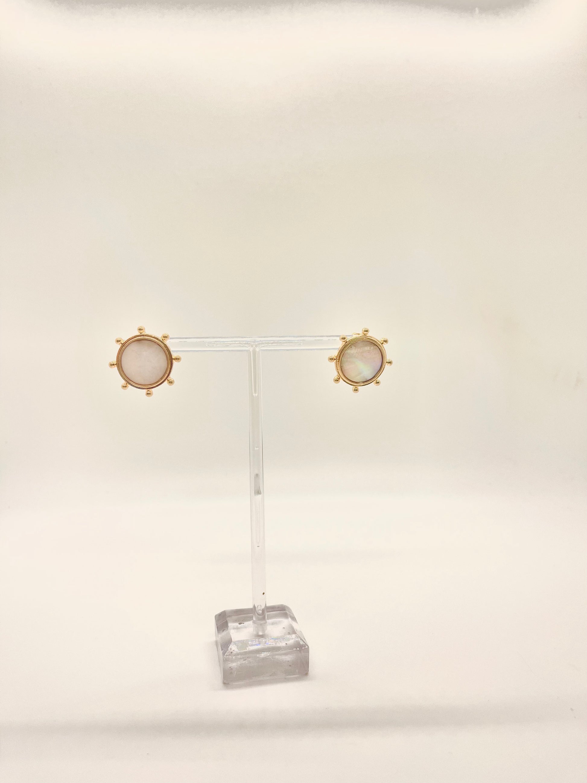 These gold, hypoallergenic earrings feature a dazzling circle pendant, with a shimmering center made of an iridescent mother of pearl type stone. Perfect for any occasion, these earrings are sure to make a statement and elevate your style. Pairs perfect with our Mother of Pearl Studded Circle Pendant Necklace!