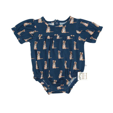 This Navy Tiger Bamboo Bubble outfit combines adorable tiger prints with soft, breathable bamboo fabric to keep your baby comfortable all day. Its roomy bubble design allows for easy movement and diaper changes, making it a practical and charming choice for your little one. Perfect for playtime or naps, this outfit supports your baby's comfort and style effortlessly.