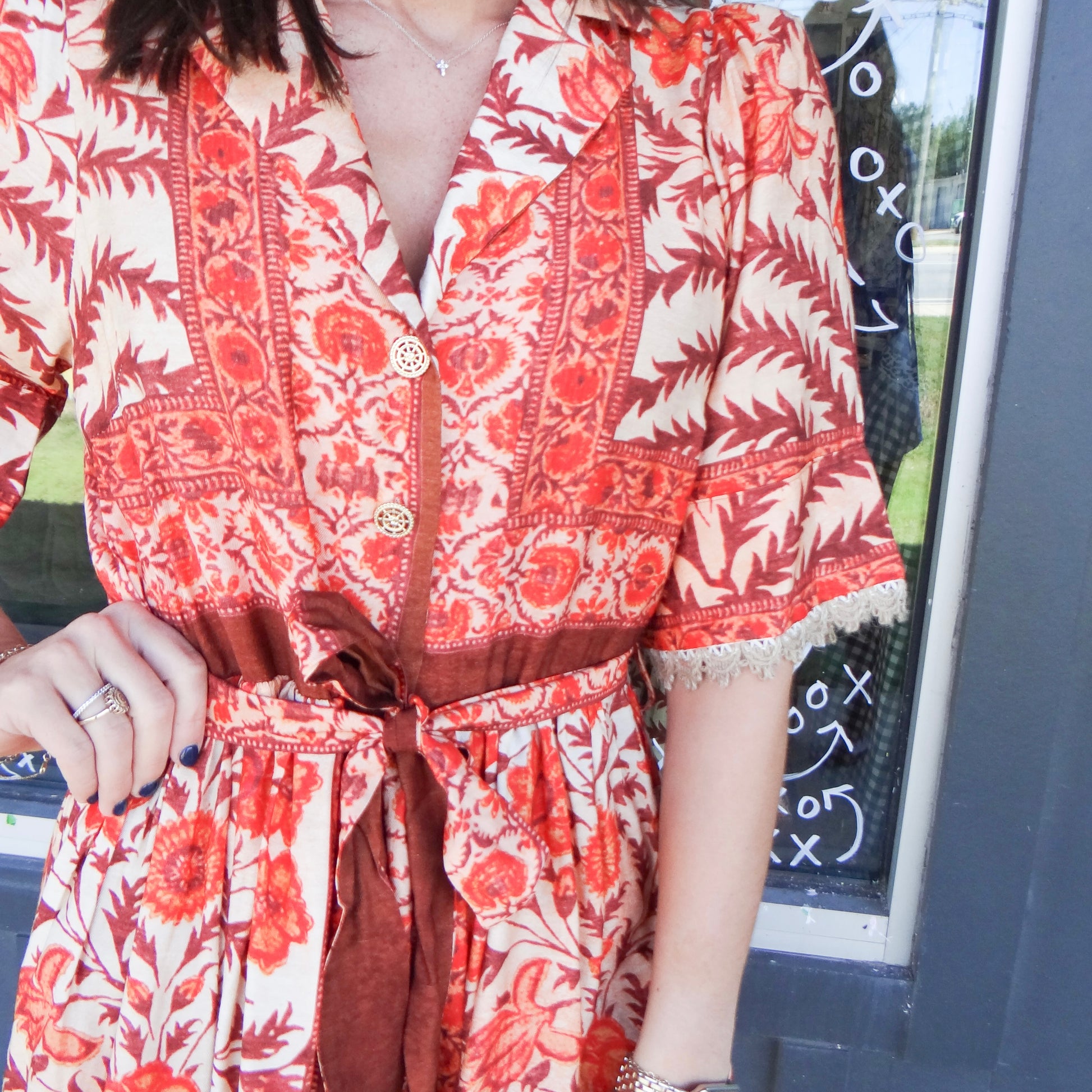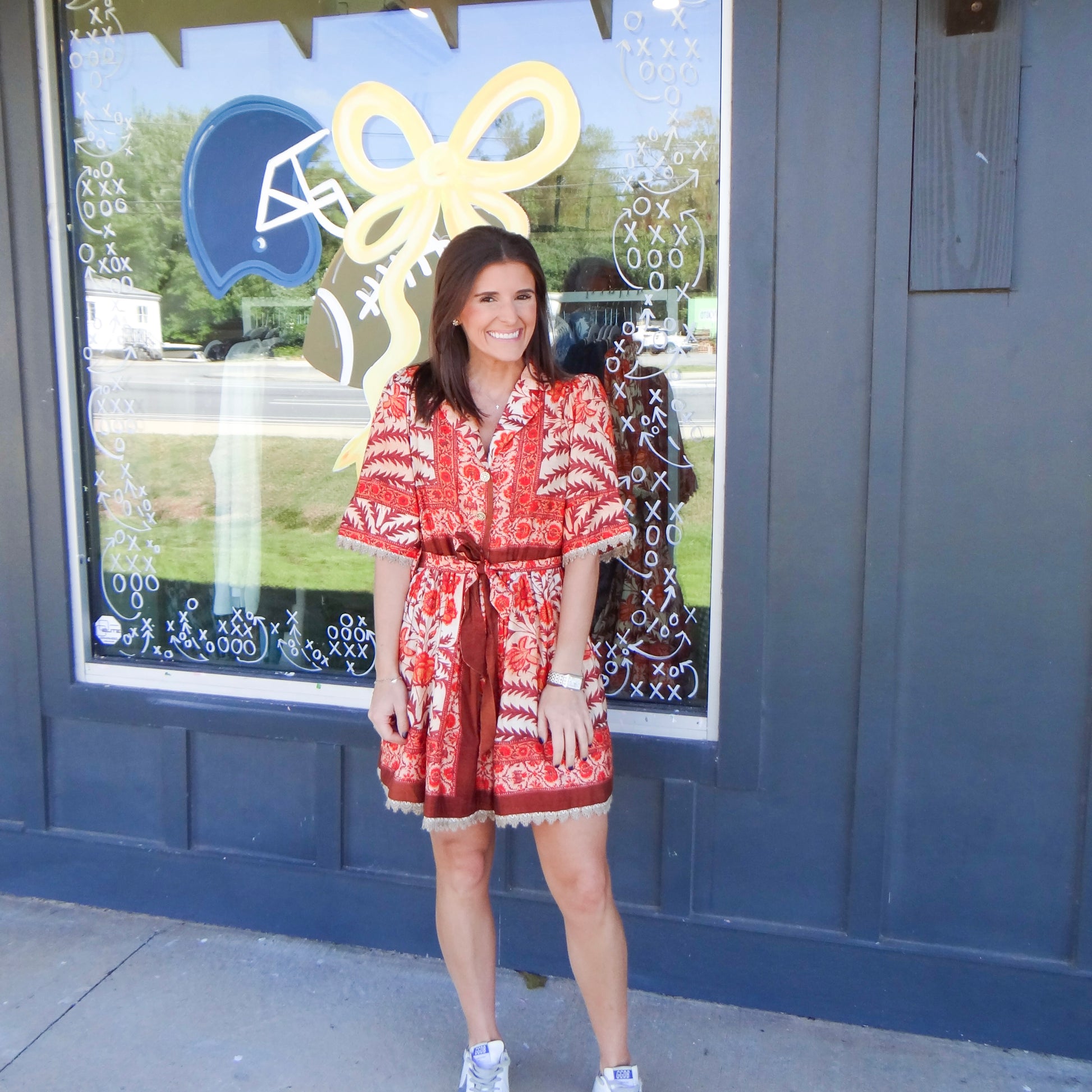 This Orange Out Belted Dress combines vibrant orange and rust tones in a stylish patterned design, perfect for Auburn gameday or fall outings. Featuring short sleeves and a flattering mini length, it includes a belt to accentuate your waist and create a polished silhouette. Comfortable and eye-catching, this dress effortlessly blends team spirit with seasonal style to keep you looking confident and festive throughout the season.