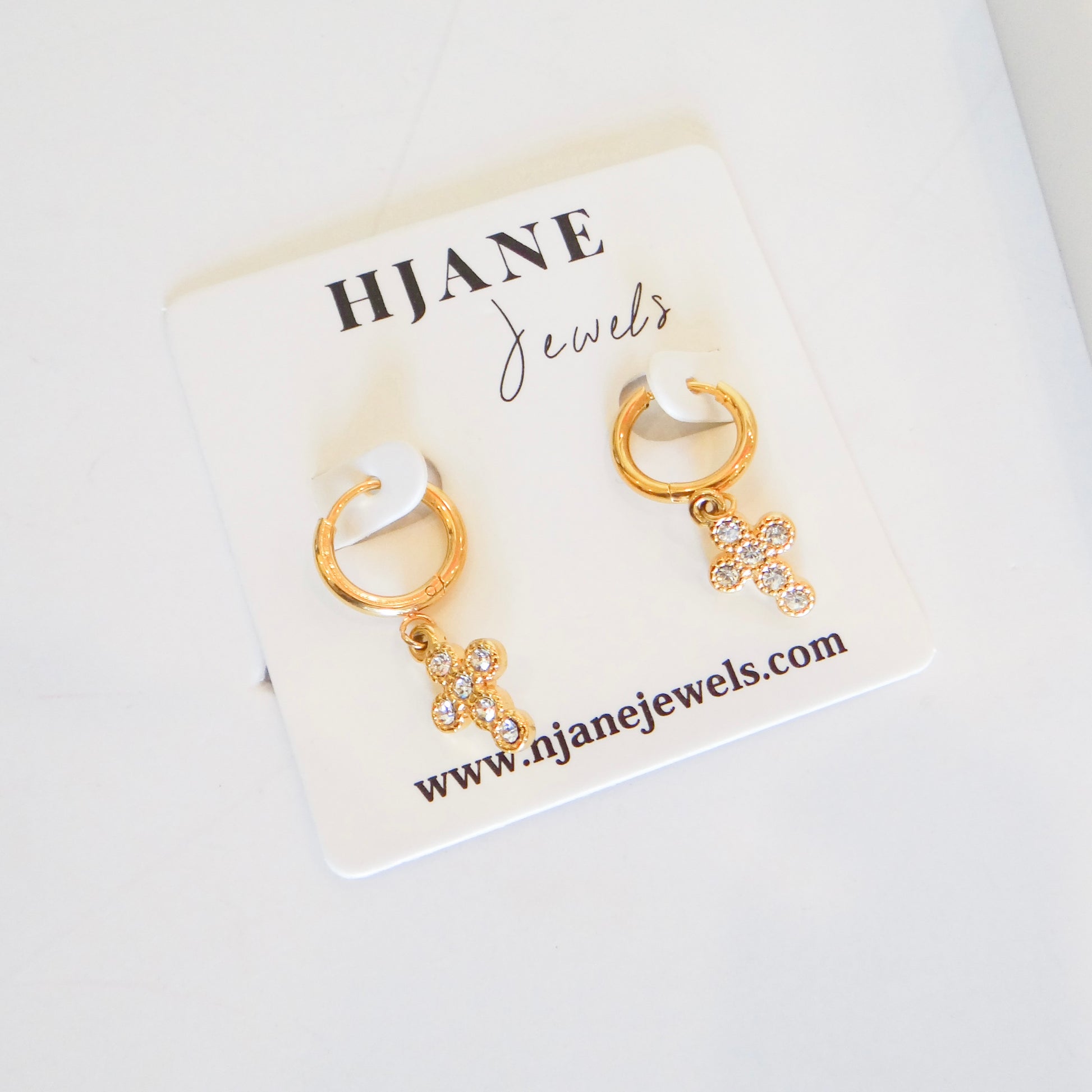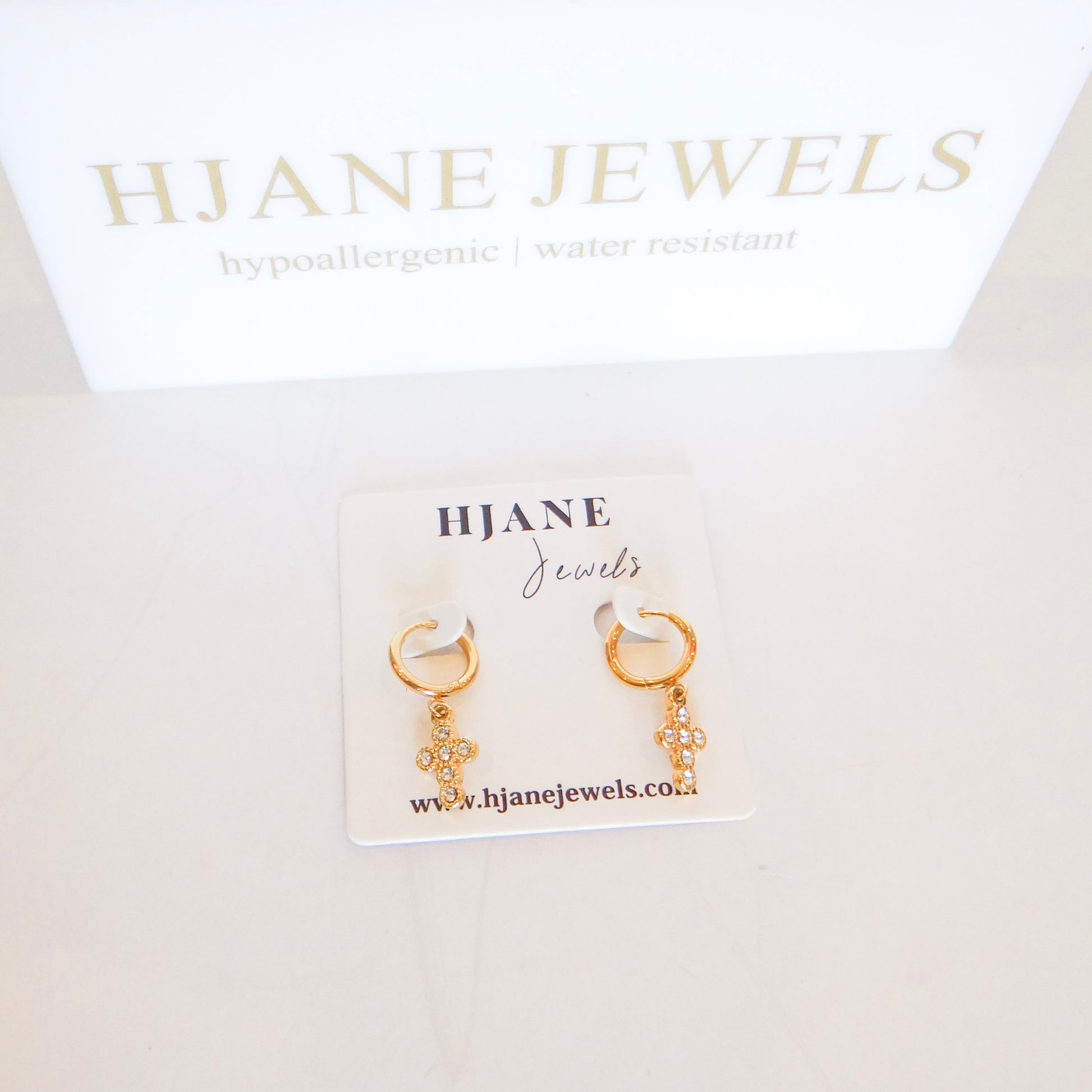 Elevate your everyday look with these stunning gold huggie hoop earrings featuring a delicate pave cross charm. Crafted by hjane Jewels, these hypoallergenic earrings are perfect for sensitive skin and designed to withstand daily wear with water-resistant construction. The secure huggie style keeps them comfortably in place, while the sparkling cross detail adds a touch of elegance and spiritual significance. Versatile enough for casual outings or special occasions, these earrings combine style with practical durability.