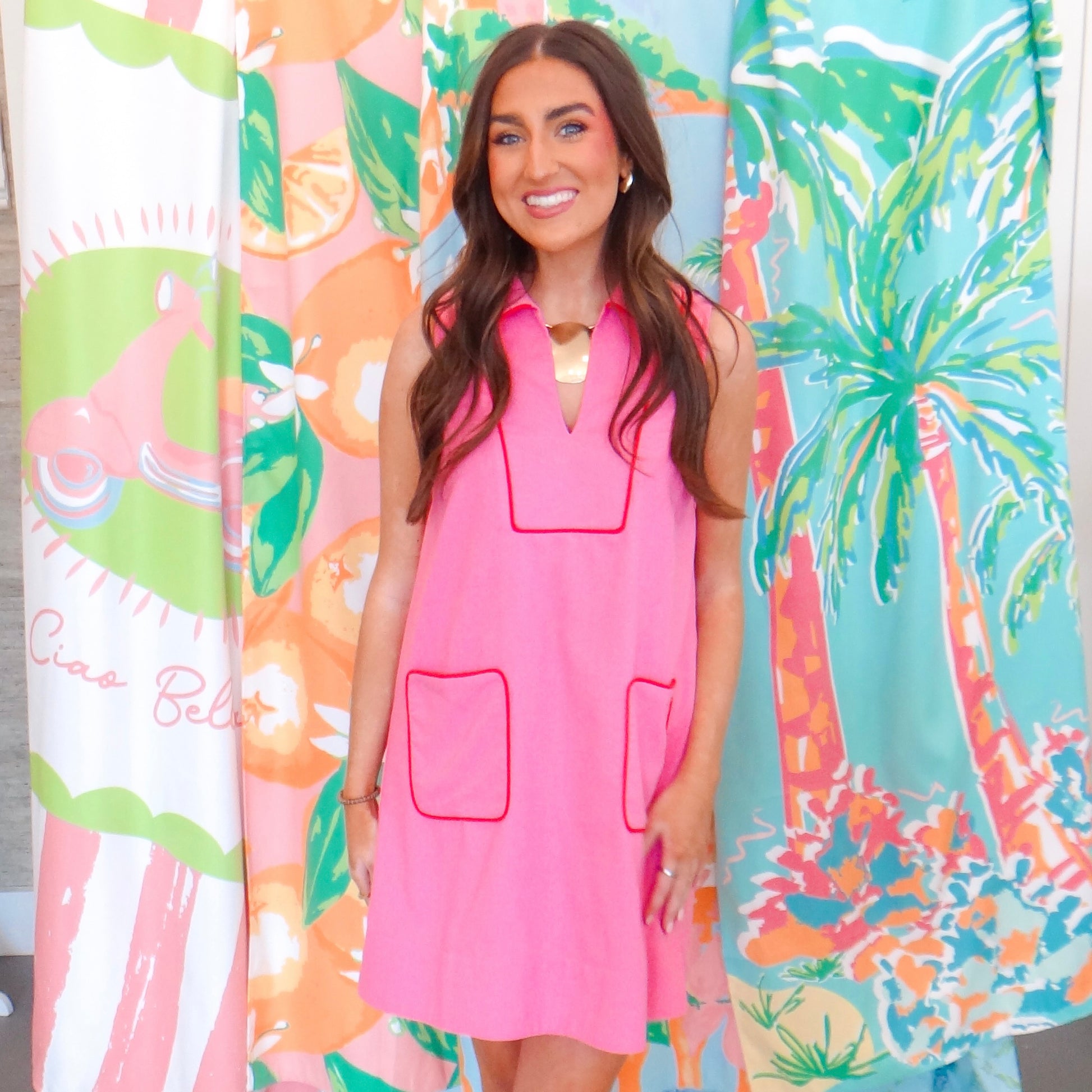 Effortlessly chic and playfully designed, the Pink Cabana Dress brings summer vibes year-round. This sleeveless mini features bold red piping that adds a pop of contrast, while functional front pockets keep your essentials close. Perfect for casual outings, beach days, or whenever you want to feel cute and confident. The relaxed fit and vibrant color combination make it an instant wardrobe favorite for those who love fun, feminine style.