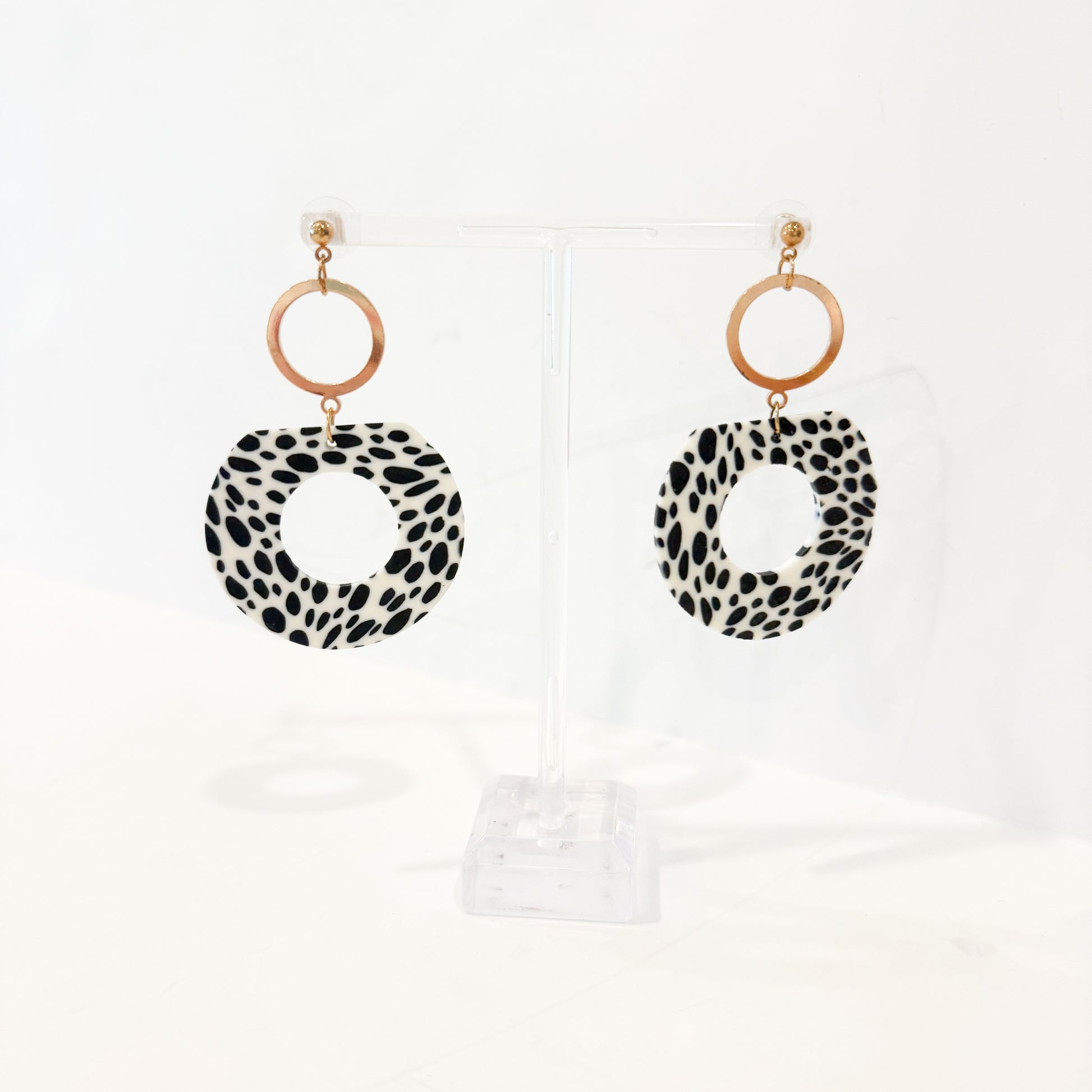 These charming polka dot hoops blend timeless elegance with playful style. Crafted in a sophisticated mix of gold, black, and white, they're the perfect accessory to brighten your everyday look or elevate a special occasion. The cute polka dot pattern adds a touch of whimsy while the classic color palette keeps them versatile enough to pair with virtually any outfit. Whether you're dressing up or keeping it casual, these hoops bring a cheerful confidence to your personal style.
