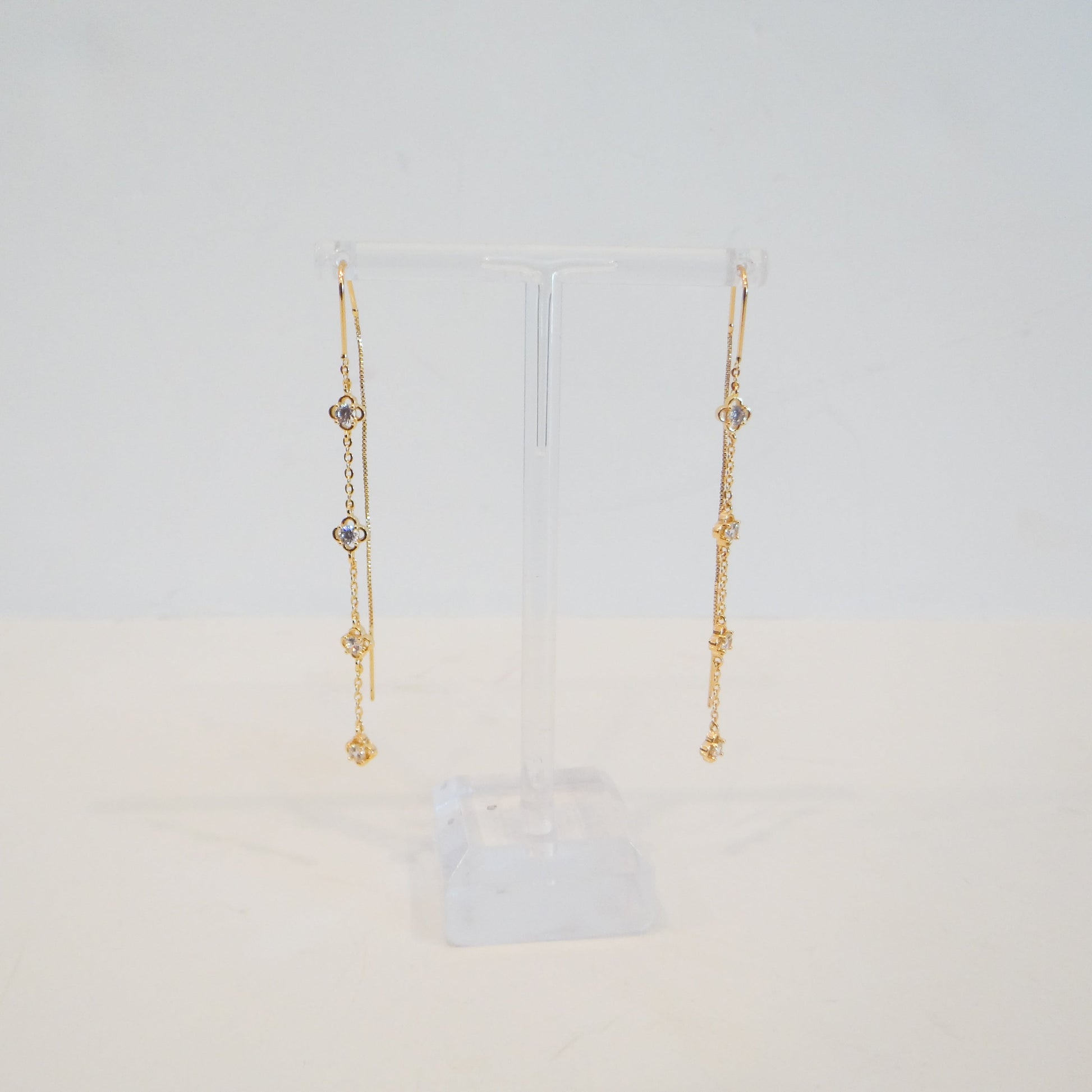 Elevate your everyday look with these charming drop earrings featuring delicate flower-shaped rhinestone accents. Each earring showcases four sparkling stones arranged in a graceful design, crafted in warm gold tones that complement any skin tone. The adjustable long backs ensure a secure, comfortable fit throughout your day, whether you're heading to the office or out for an evening. Perfect for adding a touch of feminine elegance to your jewelry collection without overwhelming your style.
