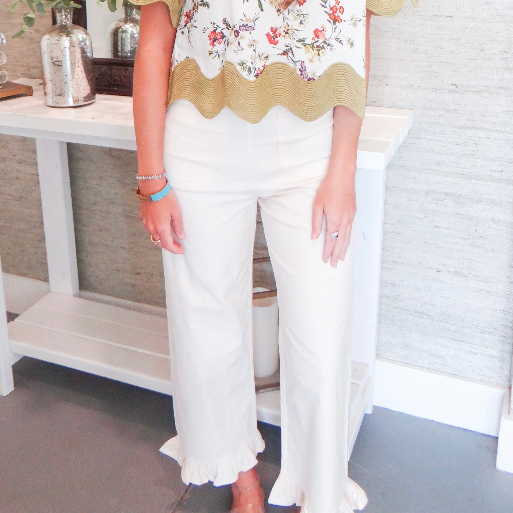 These bone-colored pants feature charming pocket details and a flattering straight leg cut for comfortable wear. The ruffle hem adds an adorable touch, making them perfect for everyday style with a gentle, playful edge.