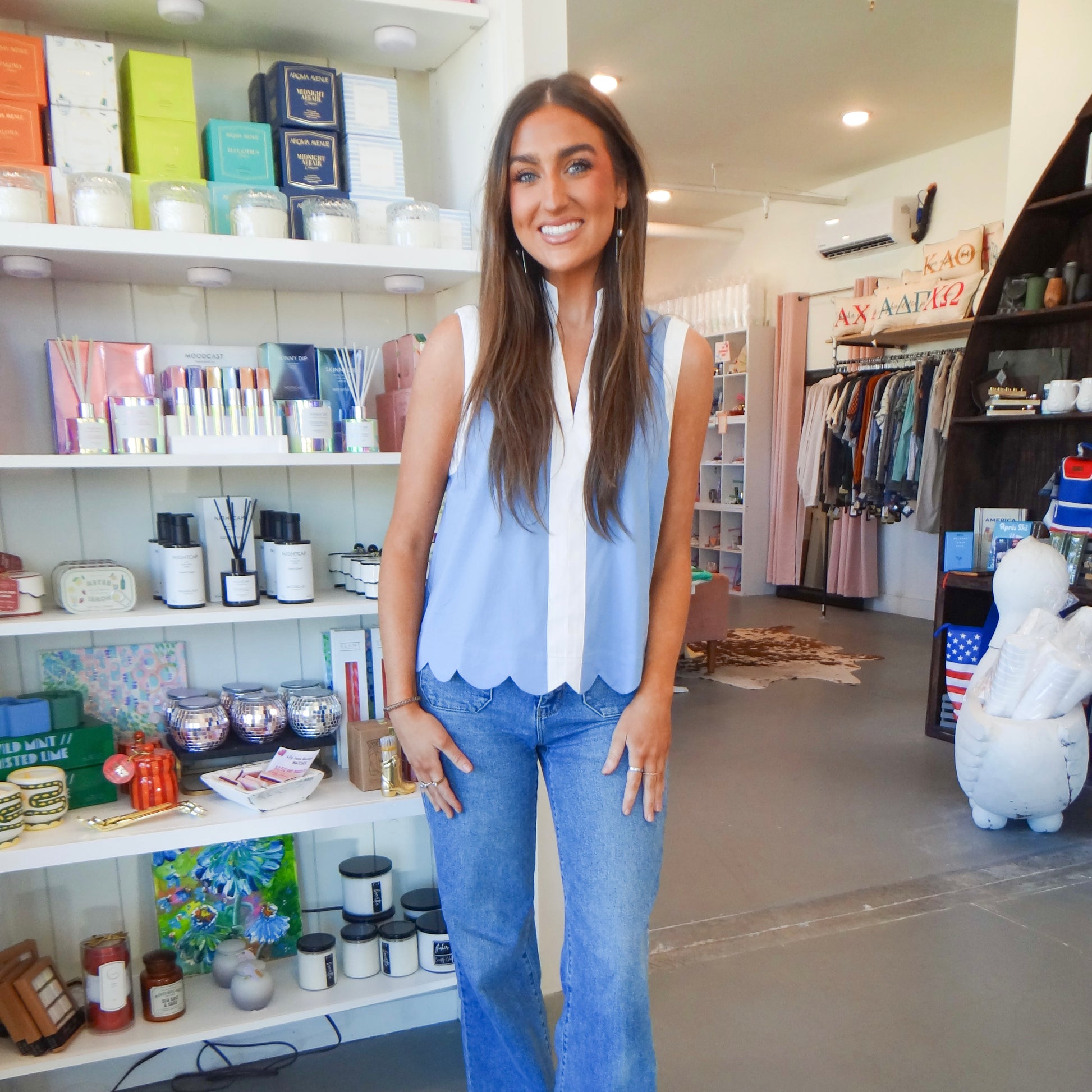 Embrace effortless warmth with the Santorini Skies Top, a breezy sleeveless essential perfect for spring and summer days. This light blue beauty features crisp white colorblocking that adds visual interest and versatility to your wardrobe. The charming scallop edge along the hem brings a delicate, feminine touch that elevates any casual look. Layer it over a slip dress, pair it with your favorite denim, or wear it solo on those perfect weather days. Whether you're heading to brunch or enjoying an outdoor adventure, this top offers the comfort and style you deserve.