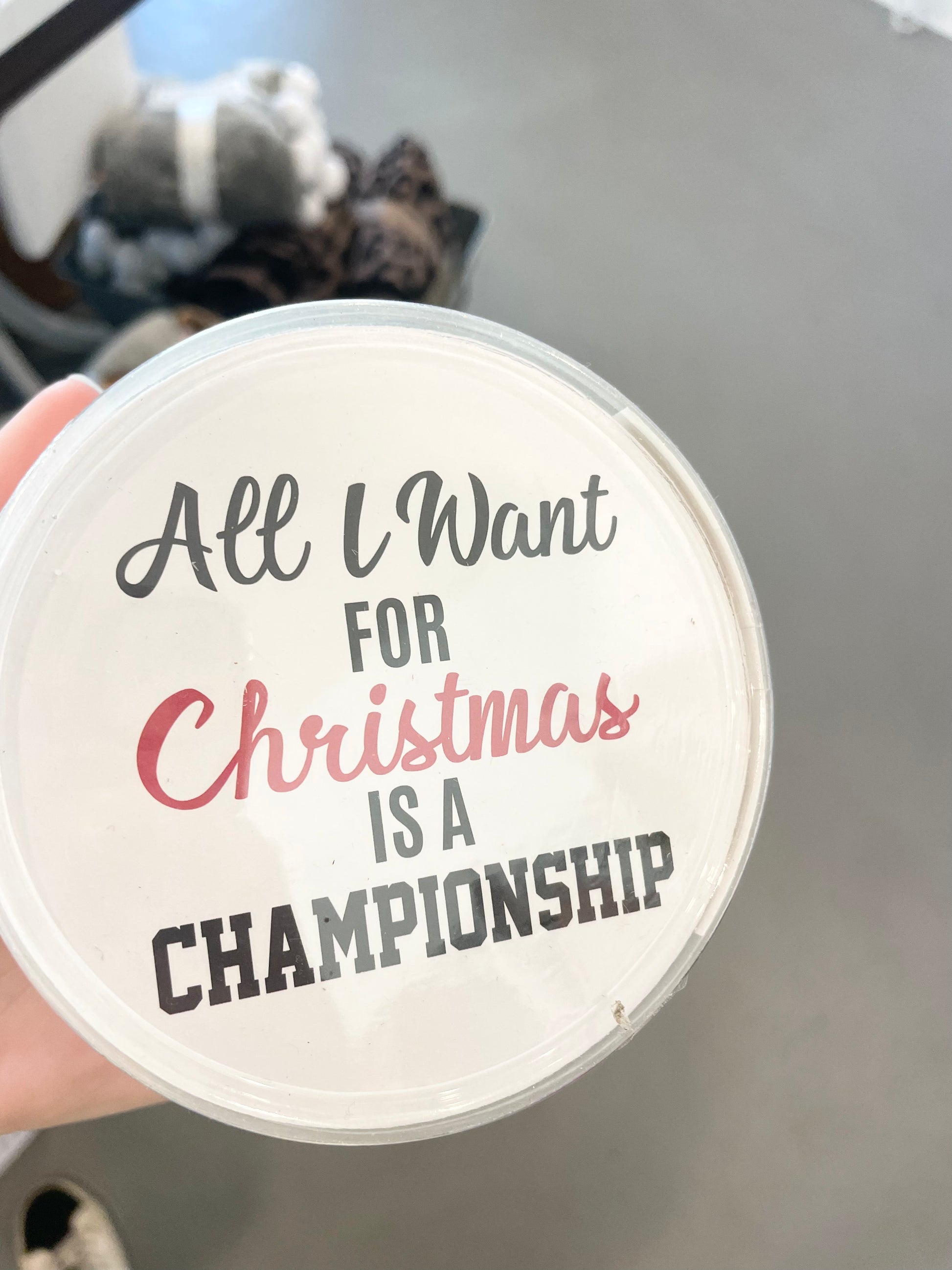 Show your team spirit with these festive reversible coasters! On one side they say "All I want for Christmas is a National Championship" and a team mascot on reverse. They're sure to get talk started! Set of 20.