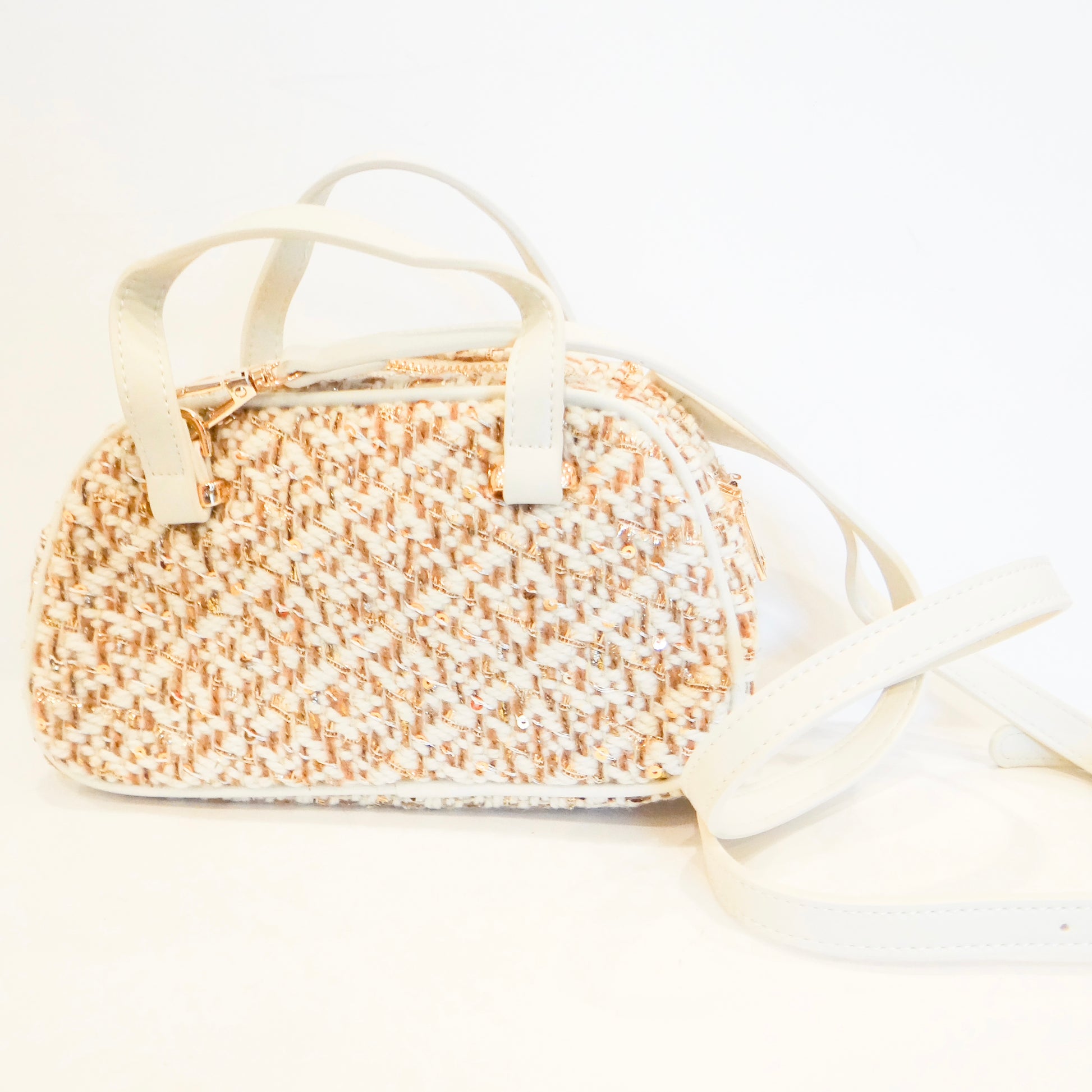 The Valerie Tweed Purse brings timeless elegance to your everyday style. Crafted in luxurious gold and white tweed, this versatile piece transitions effortlessly from a classic handheld purse to a comfortable crossbody with its adjustable strap. Perfect for those moments when you want hands-free convenience without sacrificing sophistication. Whether you're heading to brunch or running errands, this charming purse adapts to your needs while adding a touch of refined charm to any outfit.