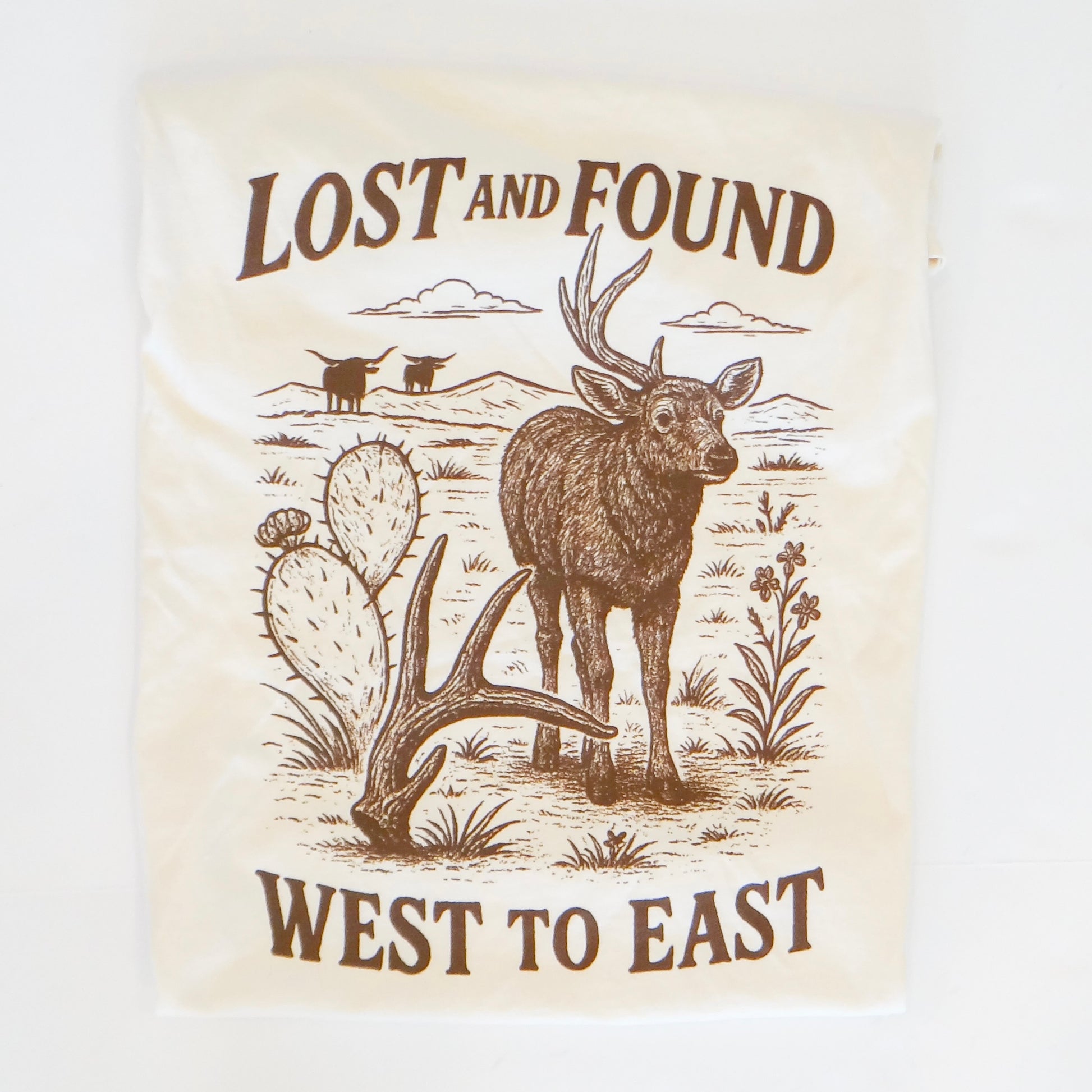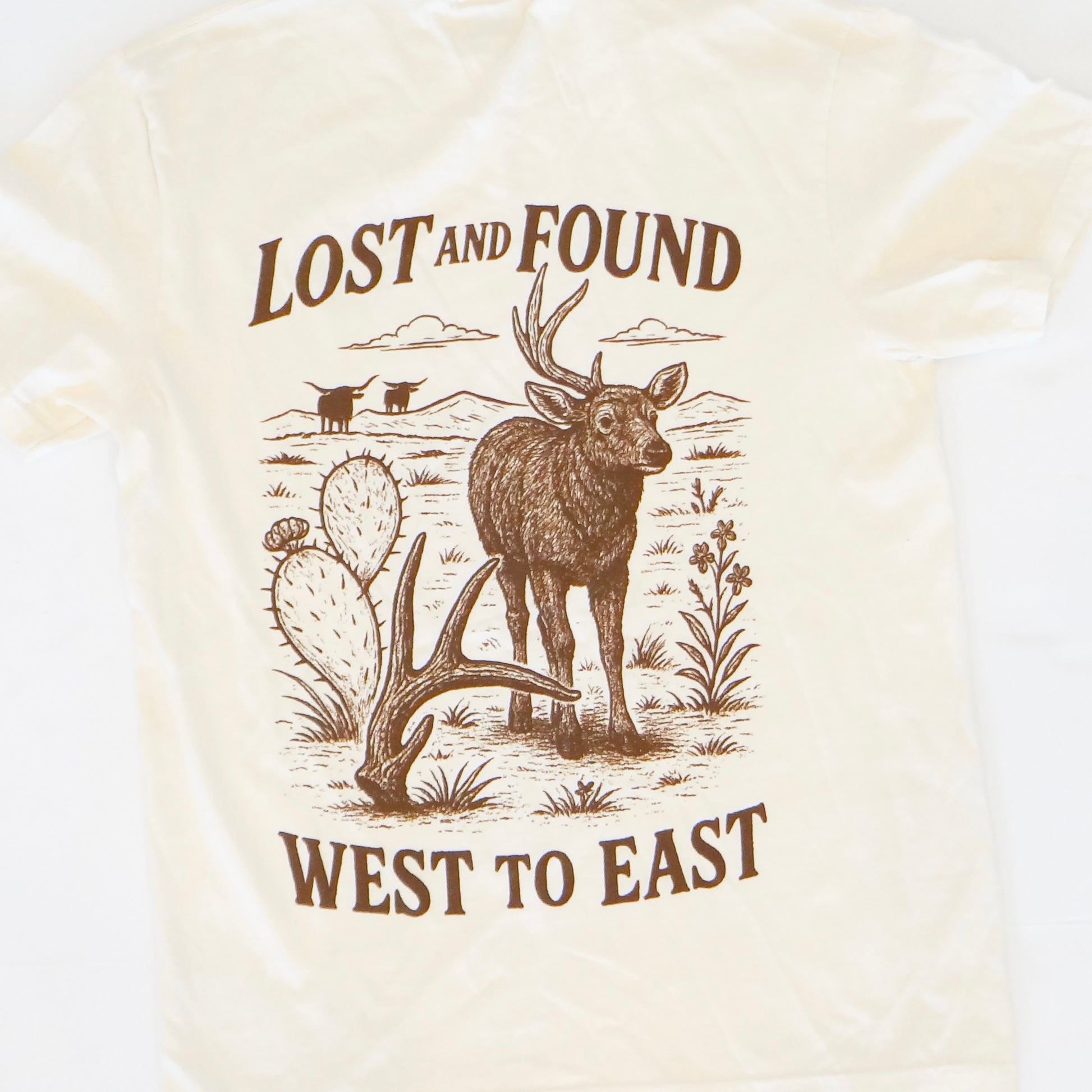 Experience comfort and style with the West to East Lost and Found Shirt by West to East. This men's short sleeve T-shirt features a distinctive western design highlighting a majestic deer, capturing the spirit of the outdoors. Made from soft, durable Comfort Colors fabric, it ensures lasting comfort for all-day wear. Perfect for those who appreciate rugged style paired with everyday ease.